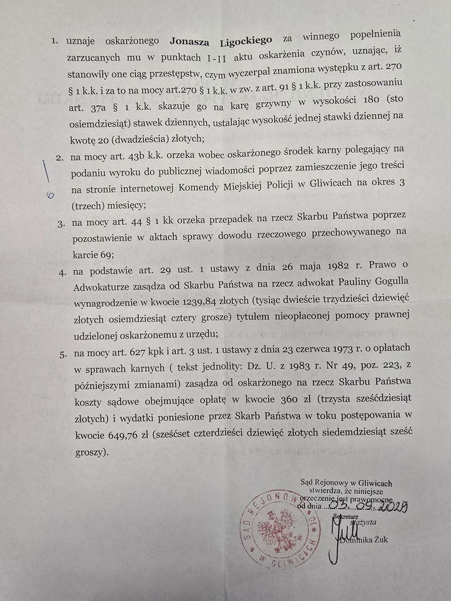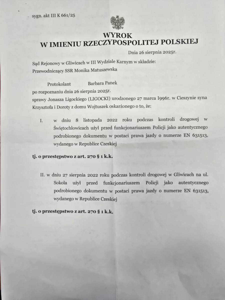 Decyzją Sądu Rejonowego w Gliwicach, publikujemy wyrok skazujący Jonasza Ligockiego, oskarżonego o użycie podrobionego dokumentu prawa jazdy podczas kontroli drogowej tj. o przestępstwo z art. 270 § 1 KK. Oskarżony został uznany winnym.