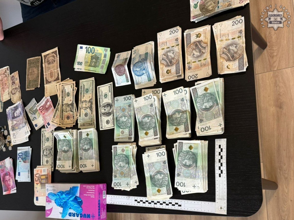 W jednym z mieszkań ujawniono znaczne ilości pieniędzy w różnych walutach, w tym złotych, euro, dolarach amerykańskich, funtach brytyjskich i frankach szwajcarskich.