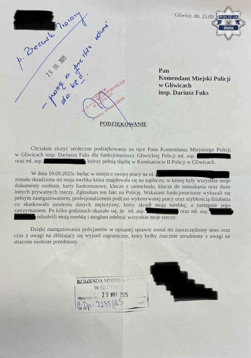 Do Komendanta Miejskiego Policji w Gliwicach oraz Komendantów Komisariatów w naszym rejonie w ostatnim czasie wpłynęło kilka podziękowań od osób prywatnych. W listach tradycyjnych i mailowych wyrażano uznanie dla pracy funkcjonariuszy Ogniw Patrolowo-Interwencyjnych oraz Rewirów Dzielnicowych.