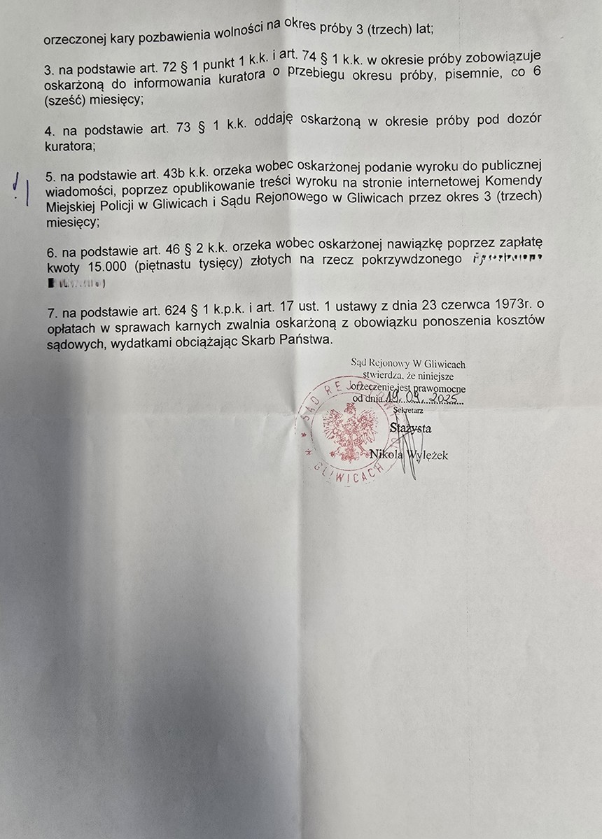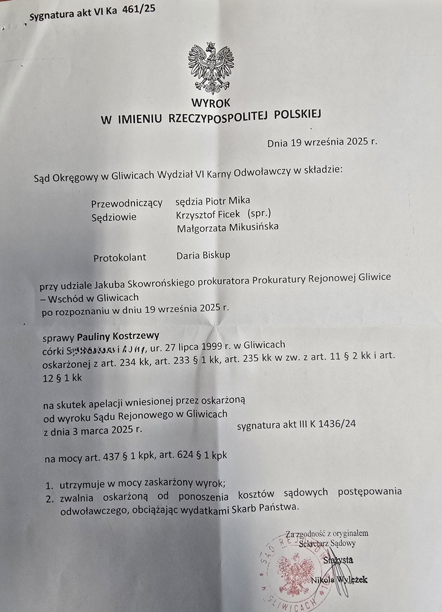 Decyzją Sądu Rejonowego w Gliwicach, publikujemy wyrok skazujący Paulinę Kostrzewa, oskarżoną o składanie fałszywych oskarżeń tj. art. 234 § 1 KK, 233 § 1 KK. i art. 235 § 1 KK Oskarżona została uznana winną.