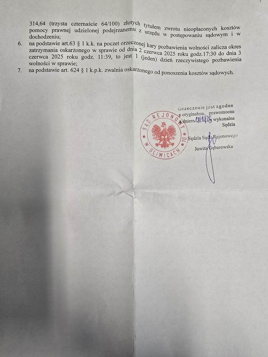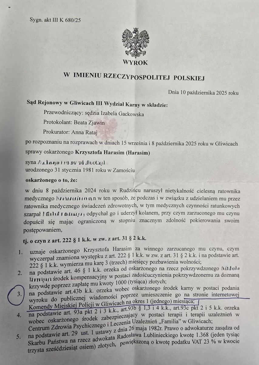 Decyzją Sądu Rejonowego w Gliwicach, publikujemy wyrok skazujący Krzysztofa Harasim, oskarżonego o naruszenie nietykalności cielesnej ratownika medycznego tj. o przestępstwo z art. 222 § 1 KK. Oskarżony został uznany winnym.