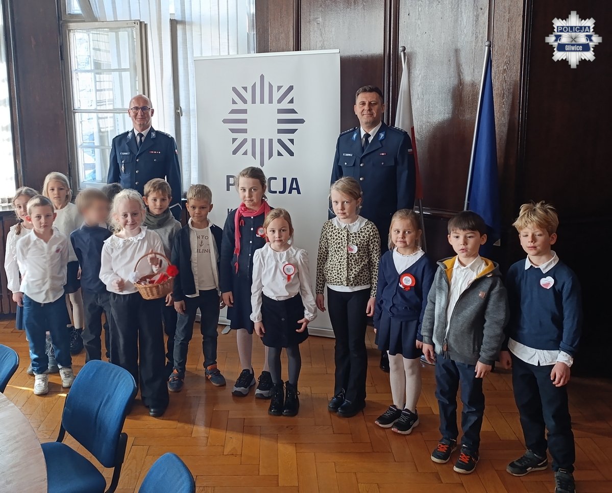 Dziś do Komendy Miejskiej Policji w Gliwicach zawitała szczególna delegacja! Uczniowie klasy 1a Szkoły Podstawowej nr 6 wręczyły I Zastępcy Komendanta Miejskiego Policji mł. insp. Arkadiuszowi Pyrkoszowi symboliczne biało-czerwone kotyliony. Gliwicki obyczaj pielęgnujący postawę patriotyczną jest już czwartą wizytą wpisującą się w historię naszej jednostki.
