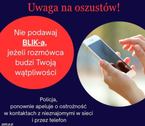 Pamiętajmy o tym, aby nigdy nie przekazywać pieniędzy obcym osobom czy też kodów do płatności mobilnych. Jeśli zostałeś oszukany to natychmiast skontaktuj się z bankiem, aby zablokować transakcję lub dostęp do konta. Zgłoś sprawę na Policję. Warto również zabezpieczyć zrzuty ekranu i wiadomości, które mogą pomóc w ustaleniu sprawców.