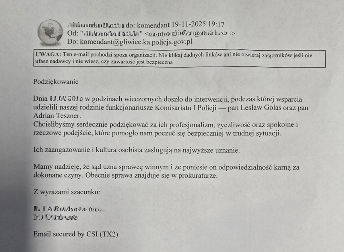 Do Komendy Miejskiej Policji w Gliwicach wpłynęły podziękowania dla policjantów z komisariatu I – asp. Lesława Golasa oraz st. post. Adriana Tesznera. Mundurowi interweniowali wobec mężczyzny podejrzewanego o kierowanie gróźb karalnych.