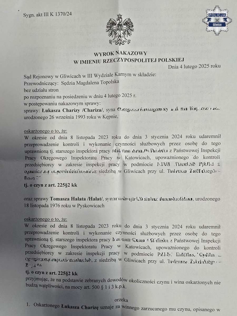 Decyzją Sądu Rejonowego w Gliwicach, publikujemy wyrok skazujący za zakłócanie kontroli przeprowadzanej w zakresie ochrony środowiska i inspekcji pracy tj. o przestępstwo z art. 225 § 2 KK.