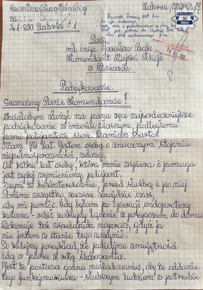 Mieszkanka Zabrza wystosowała podziękowania dla funkcjonariusza Wydziału Sztab Komendy Miejskiej Policji w Gliwicach, który na co dzień bezinteresownie wspiera i opiekuje się 75-letnią sąsiadką.