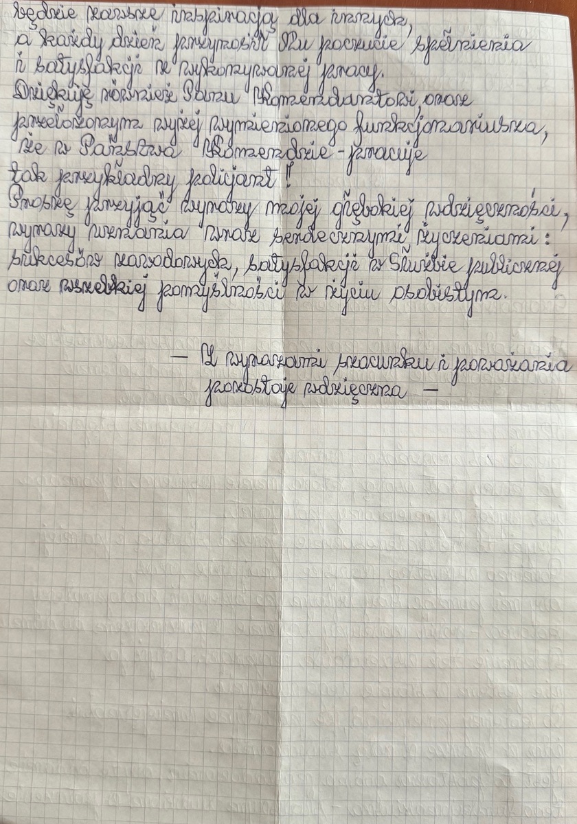 Autorka podziękowań zaznaczyła, że każdego dnia czuje się bezpieczniej, gdyż jest osobą o znaczącym stopniu niepełnosprawności, to właśnie dzięki postawie sierżanta Damiana Bartos niczego jej w domu nie brakuje i gdy tylko wraca ze szpitala, zawsze może liczyć na zrobienie zakupów, czy chwile rozmowy. Kilkukrotnie mieszkanka Zabrza podkreślała w swoim liście, że umiejętności gliwickiego policjanta idą w parze z rotą policyjnego ślubowania, licząc jednocześnie, iż taka postawa może być inspiracją dla innych młodych funkcjonariuszy.