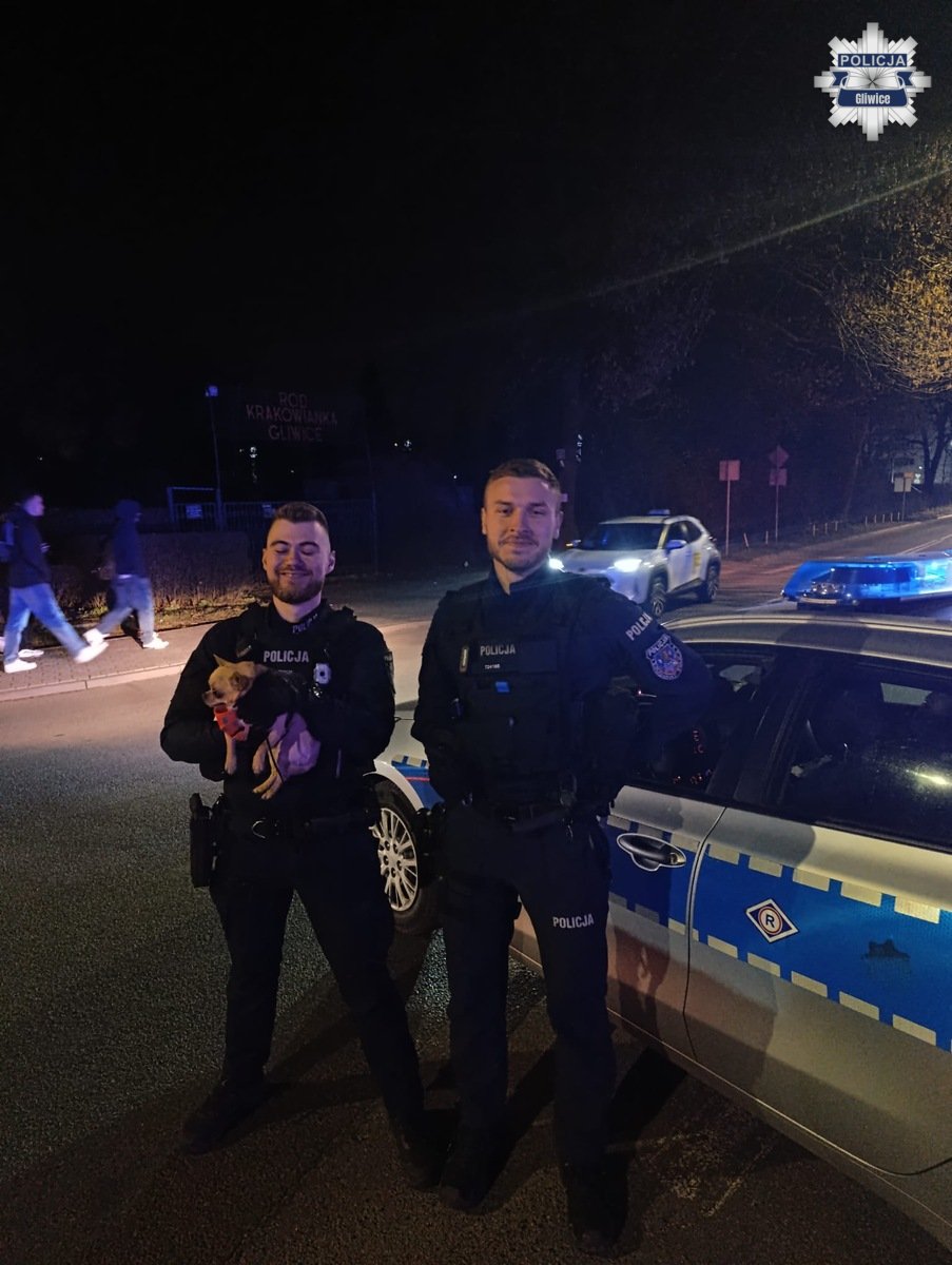 Mundurowi z Komisariatu Policji V w Gliwicach st. post. Patryk Rafa i post. Kacper Węglorz w minioną sobotę pełnili służbę podczas zabezpieczenia prewencyjnego Gali „FAME 30 ICONS” w „PreZero” Arena Gliwice, w okolicach Parku Chrobrego w Gliwicach, gdy przestraszony właściciel psa rasy Chihuahua poinformował ich o ucieczce pupila. Podczas całego zabezpieczenia wraz z innym patrolami przy okazji wypytywali spotkanych uczestników gali, czy nie zauważyli gdzieś podobnego czworonoga.