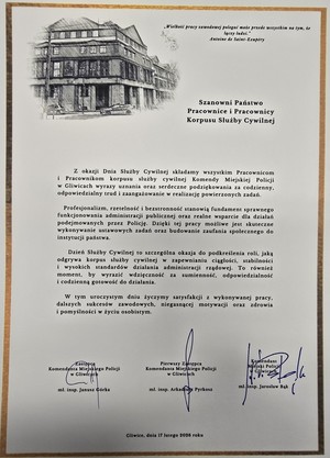 Z okazji Święta Służby Cywilnej przypadającego 17 lutego, Komendant Miejski Policji w Gliwicach wraz z I Zastępcą oraz Zastępcą Komendanta Miejskiego Policji w Gliwicach składają wszystkim członkom Korpusu Służby Cywilnej, Pracownicom i Pracownikom Policji najserdeczniejsze życzenia i słowa podziękowania.