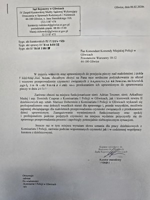 Do Komendy Miejskiej Policji w Gliwicach wpłynęły podziękowania z Sądu Rejonowego w Gliwicach za wzorowe przeprowadzenie czynności związanych z przekazaniem małoletnich osobom uprawnionym do sprawowania pieczy. Działania realizowane na polecenie sądu i wymagały szczególnej rozwagi, opanowania oraz wrażliwości.