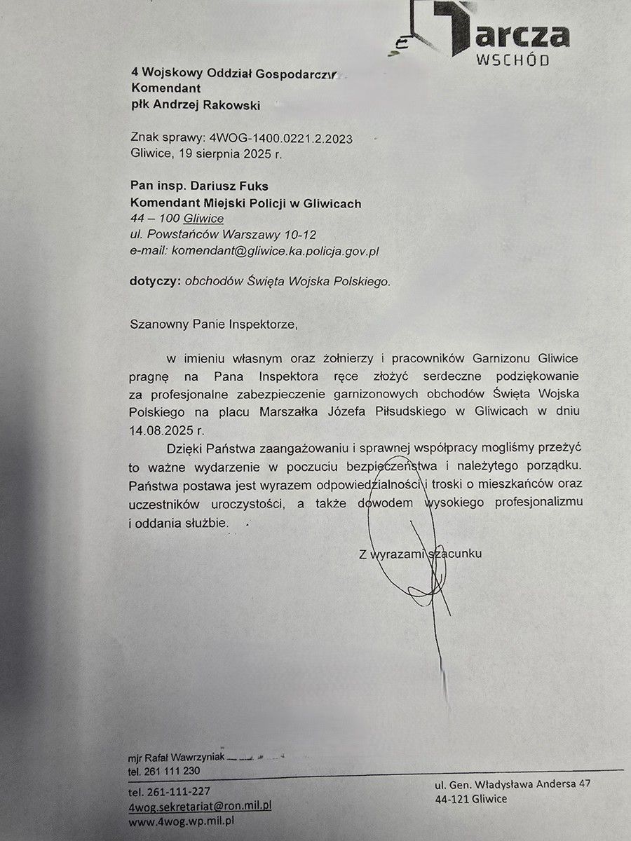 Podziękowania od 4 Wojskowego Oddziału Gospodarczego w Gliwicach